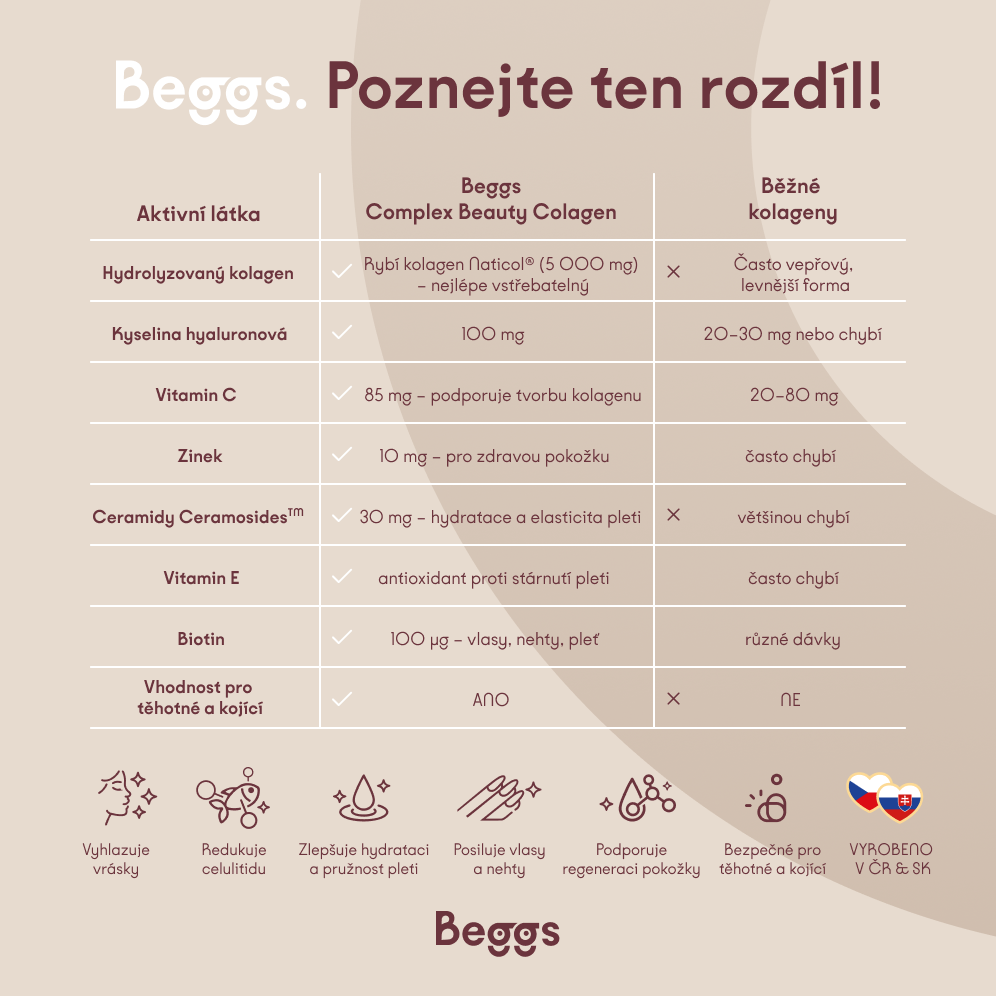 Beggs Beauty Complex Collagen je prémiový kolagenový doplněk stravy s jedinečným složením navržen pro ty, kteří chtějí krásnou pleť a lesklé vlasy díky podpoře zevnitř.