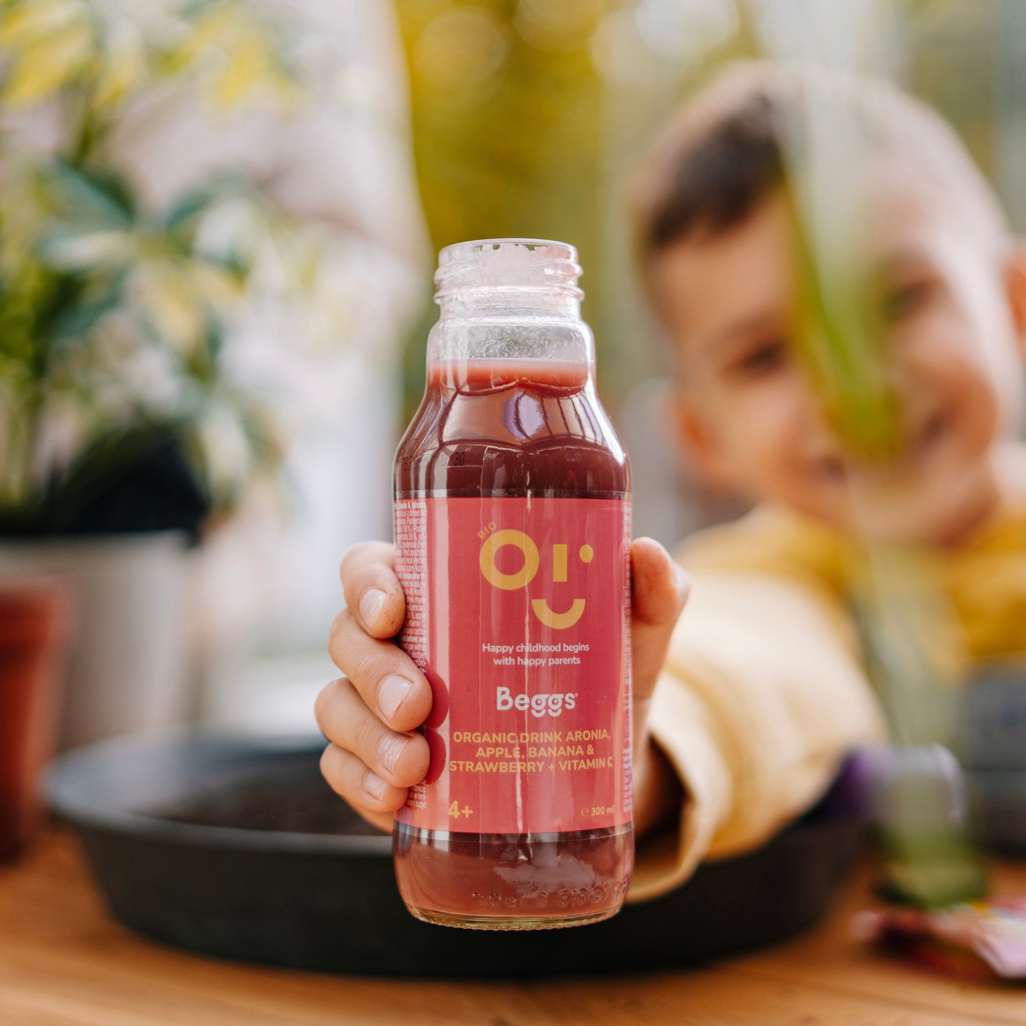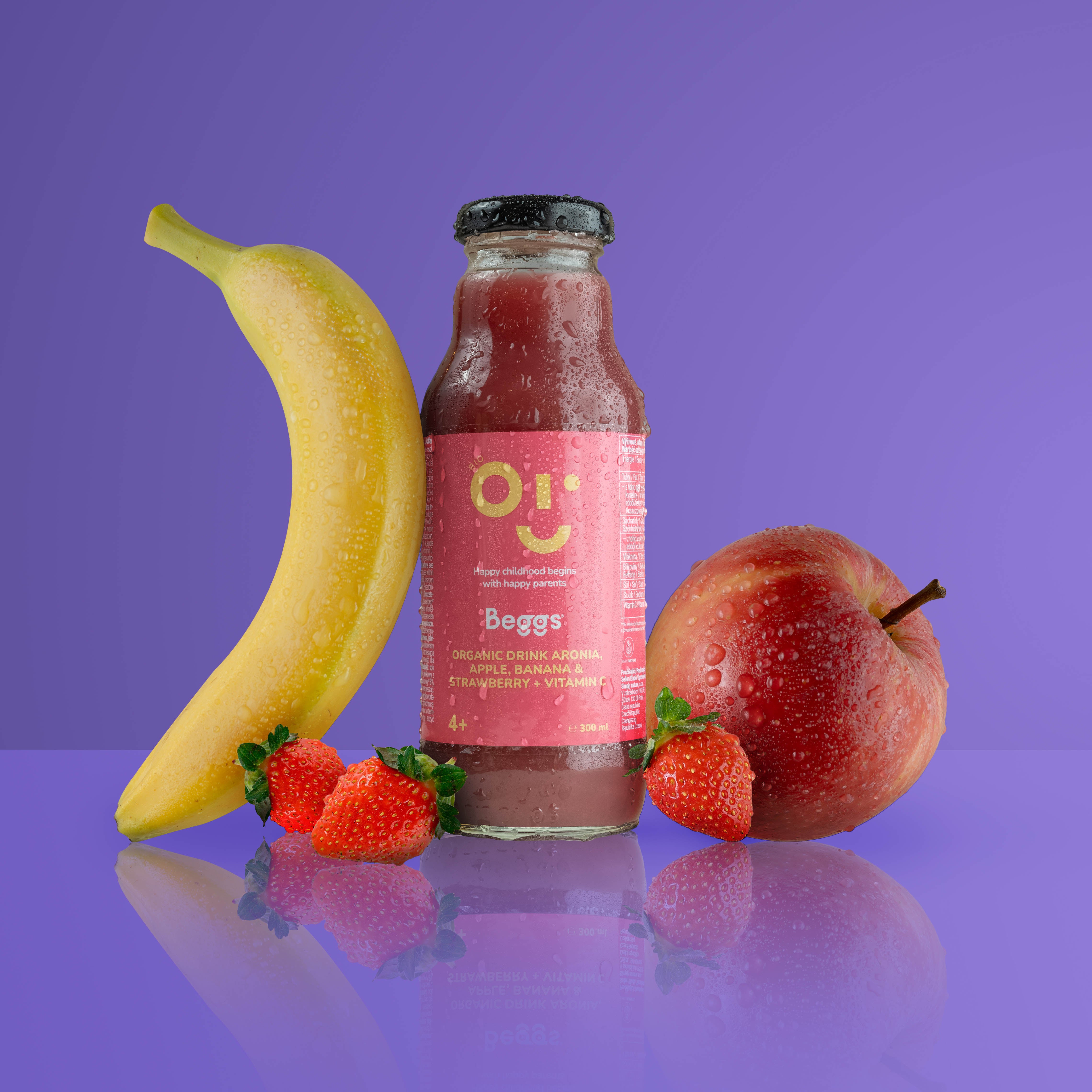 Beggs BIO Nápoj aronie, jablko, banán & jahoda (300 ml) je ovocný nápoj vyrobený z části z koncentrátu a z dřeně od ukončeného 4. měsíce. Nápoj v BIO kvalitě je pasterizován, bez přidaného cukru¹, bez lepku, barviv² a konzervantů².