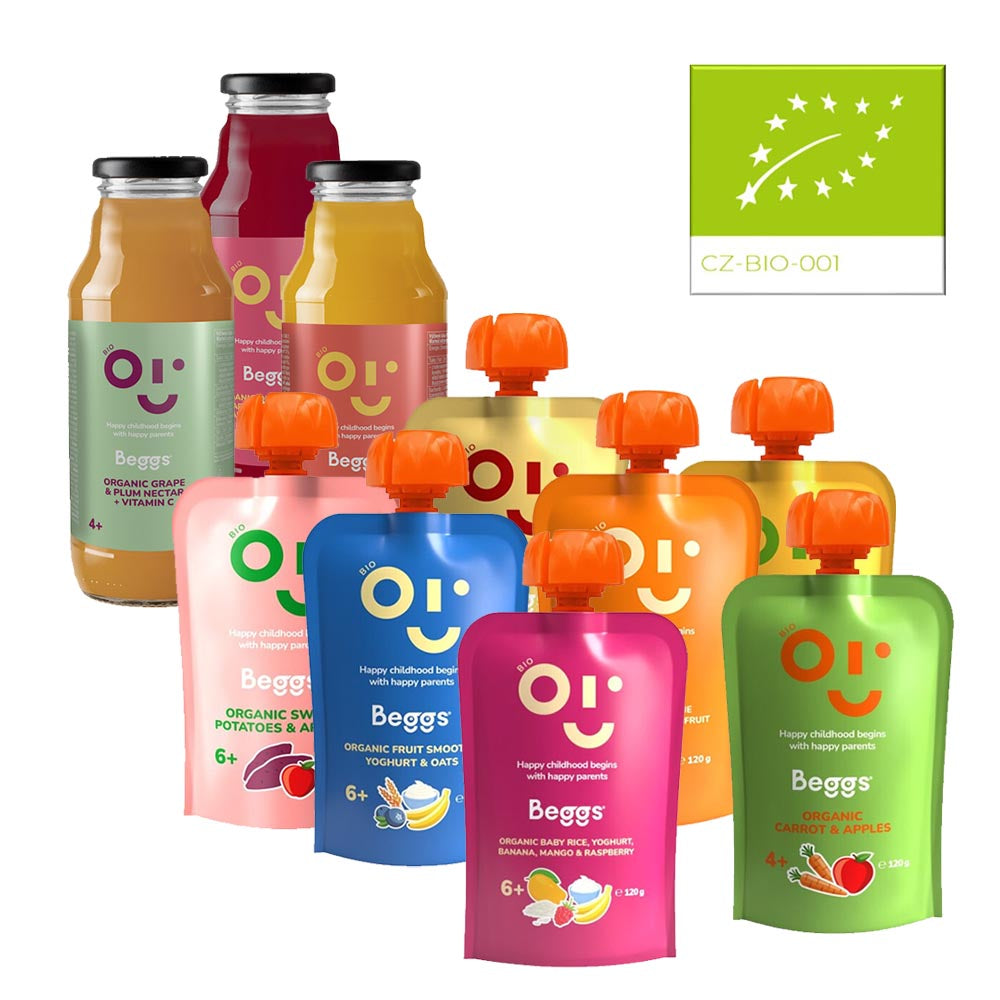 Na obalech příkrmů a nápojů Beggs najdete logo BIO certifikace (zelený list z hvězdiček), které je mezinárodně uznávaným symbolem ekologického původu a kvality potravin. Tato značka je zárukou, že produkt splňuje přísné legislativní požadavky na ekologickou produkci v celé EU.