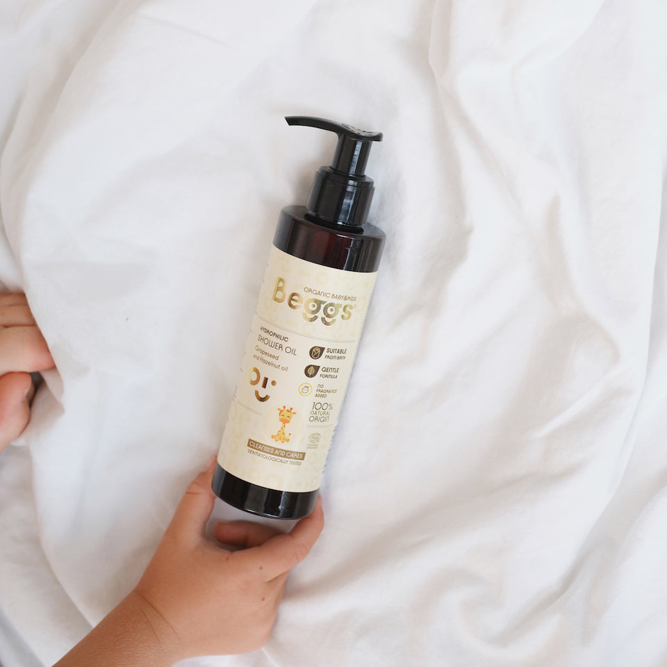 Beggs Dětský organický mycí olej (200 ml)** je šetrný i k té nejcitlivější pokožce miminek už od narození. Díky absenci éterických olejů a parfemaci je vhodný i pro pokožku, která má sklony k ekzémům. Obsahuje oleje hroznových jader, lískových ořechů a slunečnicových semínek, které zvláčňují a zjemňují pokožku a poskytují ochranu před vysoušením. Tyto oleje pochází kontrolovaného ekologického zemědělství (BIO) a 100 % složek balení je přírodního původu.